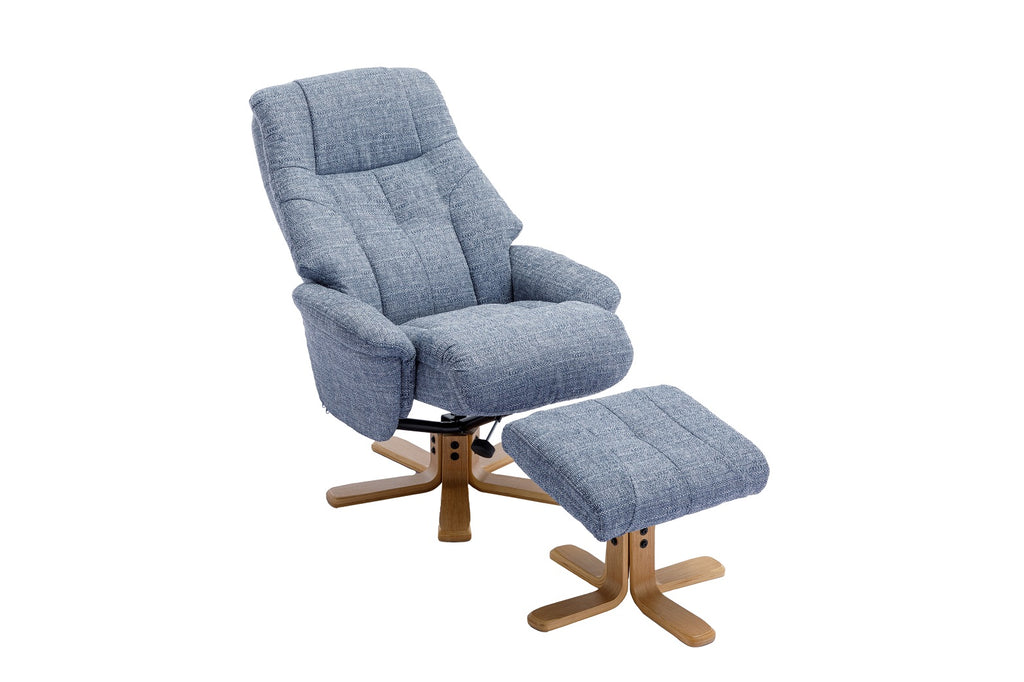 Grey recliner & matching footstool both on crucifix bases in reclined position
