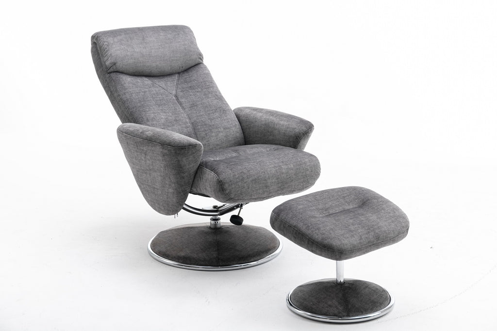Beige plush swivel recliner chair & matching stool both on circular bases